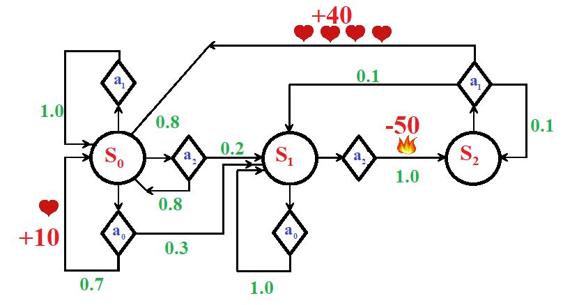 for all $i \in \{0,..,m\}:$ \[ V_{k+1}(S_i) = \max\limits_{a \in \{a_0,a_1,...,a_n\}} \sum_{j=0}^{m} \mathbb{P}(S_j | S_i,a)(r(S_i,a,S_j)+\gamma V_k(S_j)) \] where $V_{k}(S_i)$ for $i=0,...,m$ are the current estimated values for each states at the $k^{th}$ iteration. Obviously, the previous sum can be optimized by knowing which states are really linked to each states $S_i$. As we can see, each values are obtained from a fixed point algorithm. Exercise [Bellman Equation]In this exercice, we want to implement with Python this Bellamn equation estimation and apply it to the previous MDP Figure.