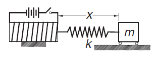 The magnetized iron block of mass $m$ is attached to a spring of stiffness $k$ and free length $L$. The block is at rest at $x = L$. When the electromagnet is turned on, it exerts a repulsive force $F = c/x^2$ on the block.