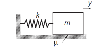 Consider the mass–spring system where dry friction is present between the block and the horizontal surface. The frictional force has a constant magnitude $\mu.m.g$ ($\mu$ is the coefficient of friction) and always opposes the motion. We denote by $y$ the measure from the position where the spring is unstretched.